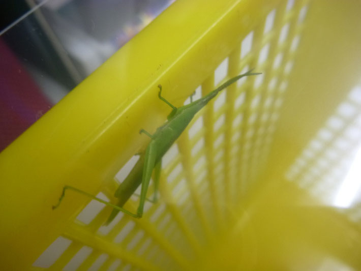 過去に飼育したバッタ~初代バッタ編①~ こんにちは、店員Kです。 バッタの飼育は今までに 3匹しています。 旧勤務先の店先でたまたまバッタを見かけたのが 始まりですね。 店員Kが最初に飼育したバッタがこちら。 葉を食べています。 この初代バッタは2月ごろまで長生きしてくれました。 店員Kは カマキリの飼育もよくするのですが、 バッタは急に飛び跳ねるので 結構驚きます(汗) カゴにエサを入れるときにはねられて カゴから出てしまったことなども…(笑) カマキリは肉食、 バッタは草食なので育て方も全然違いますしね… バッタは葉っぱを入れておくと この写真のように食べてくれます。 食べている最中はちゃんと食べているのが 分かるので、観察すると地味に楽しいですよ! ちなみにこの後にも2代目バッタや自宅周辺で 見つけたバッタの飼育などを行いましたが、 この初代が一番長生きしてくれました! と、いうより後から飼育した2匹は 以外と早く死んでしまったのです(泣 バッタは夏場に草むらなどによくいるので、 探してみると案外すぐに見つかりますよ! 店員Kの自宅周辺の草むらにも 結構います。 (自転車置いてあるのでつぶしてしまわないように いつも気を付けています。。)